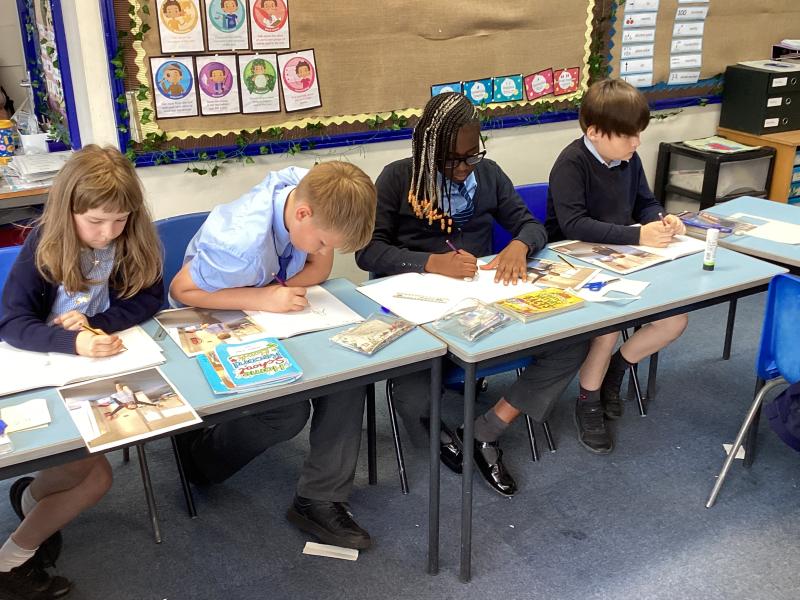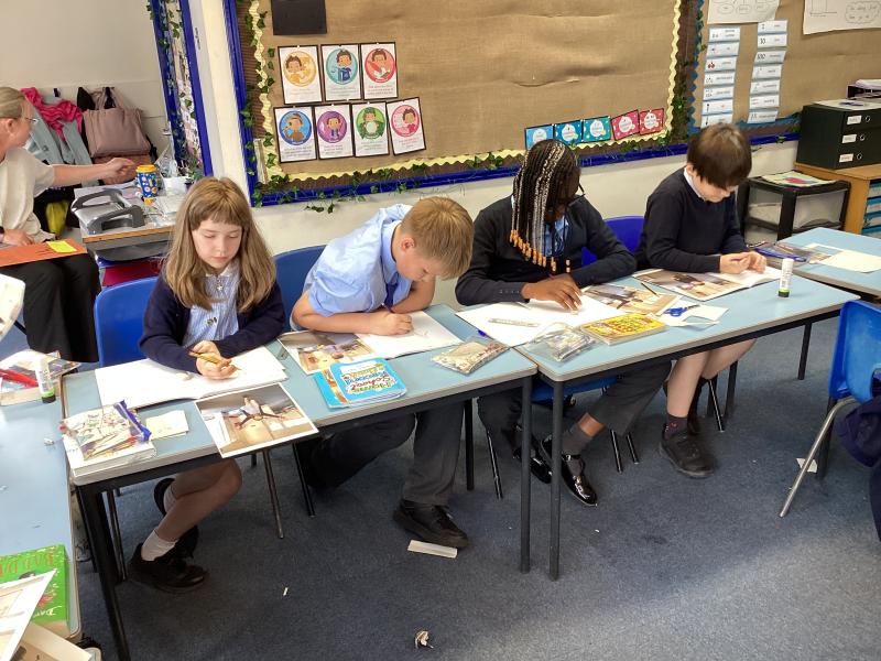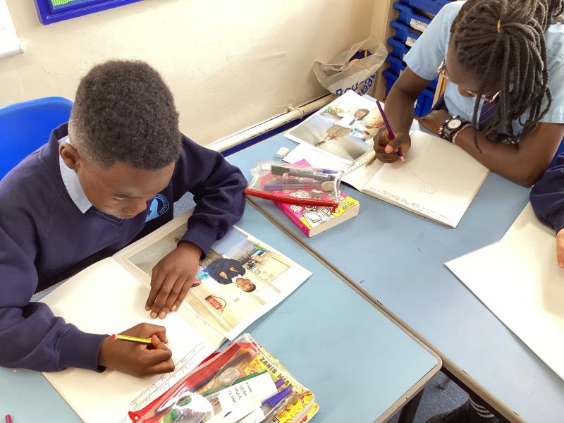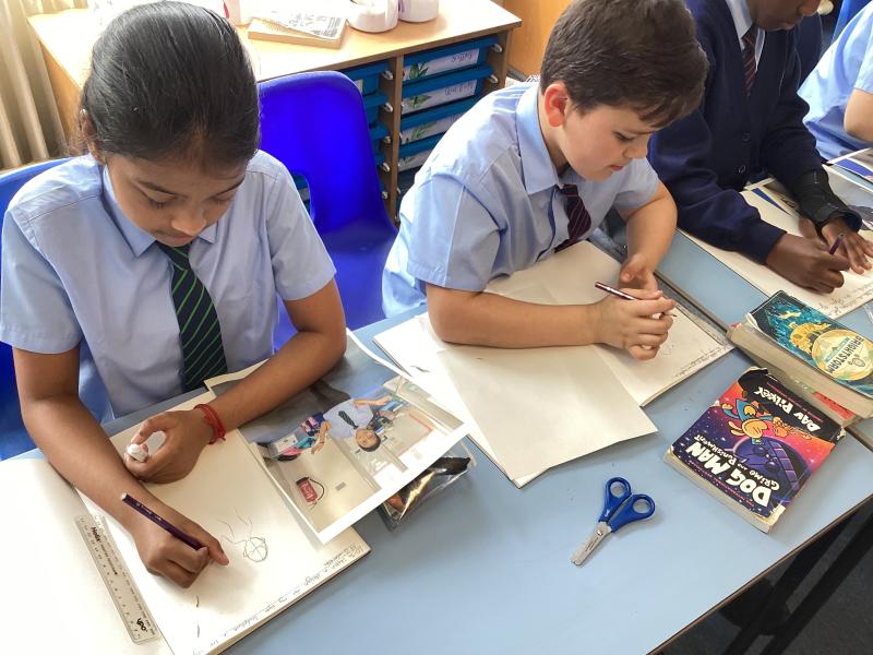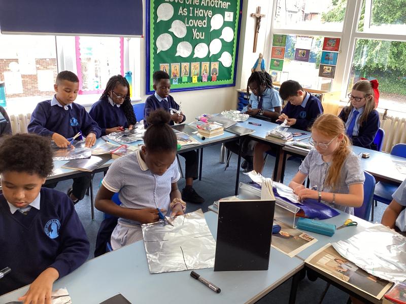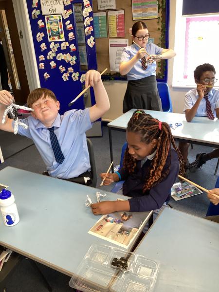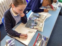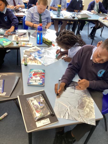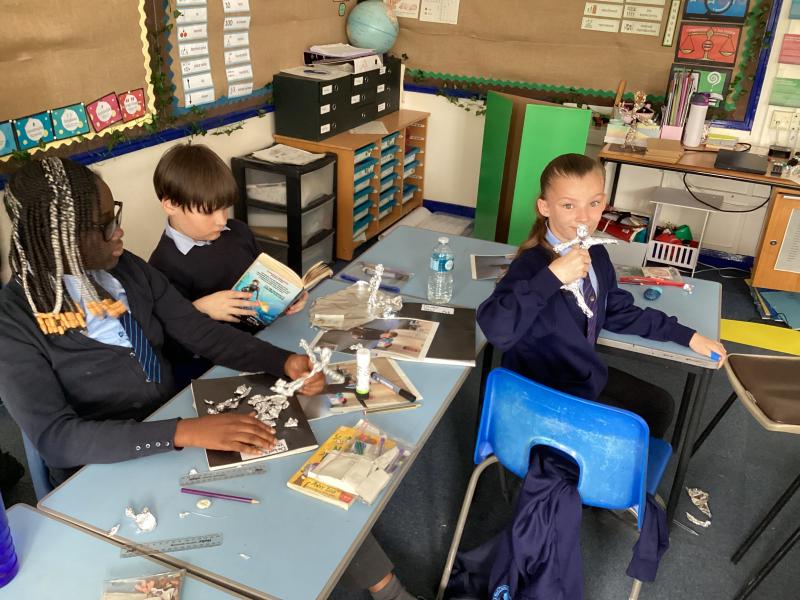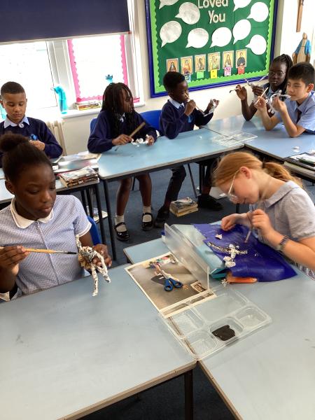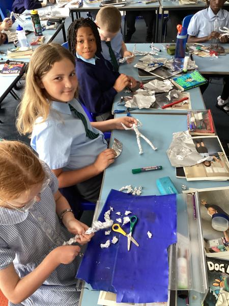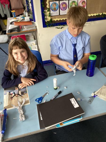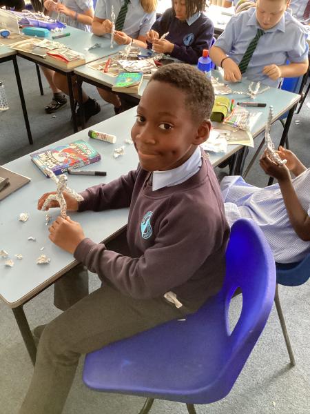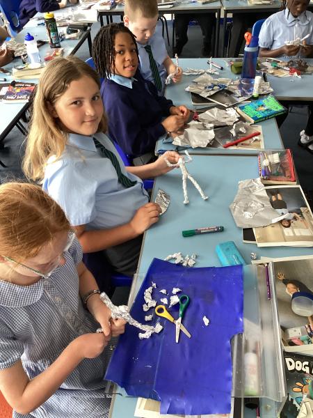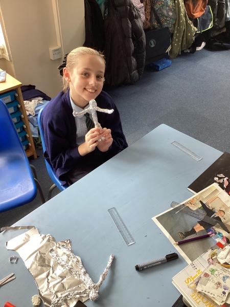 During Art Week this year, we have been studying the work of Alberto Giacometti. Giacometti creates sculptures out of bronze using thin and thick shapes for his subject's limbs and bodies. We looked at his work and offered opinions on different sculptures. We then thought about how he portrayed emotion and movement through his work and sketched the sculptures. We then created a pose to show an emotion or movement and sketched a design using this as inspiration. Next, we created a sculpture of our design out of tin foil and finally, we painted our sculptures black or brown and then gold or bronze to give them the same metallic effect as Giacometti's.