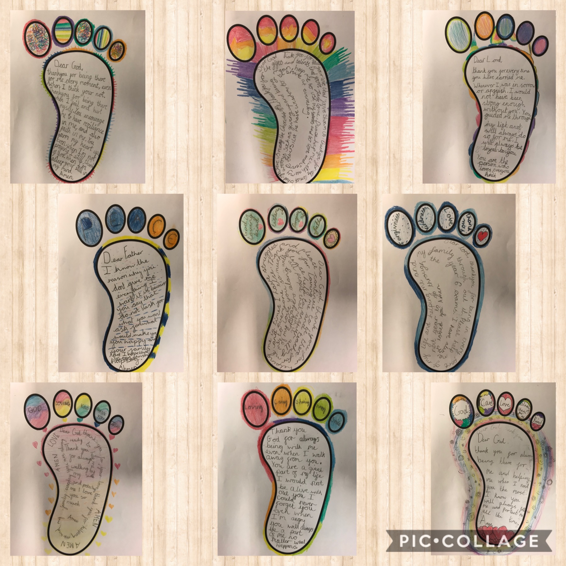As part of our Religious Education topic, recognising God as our loving Father, we read passages of scripture: Hosea 11:1-4, Amos 5:14-15, Zephaniah 3:14-15, 17-19 and Footprints in the Sand by Mary Stevenson. These all helped to remind us that God loves us unconditionally.