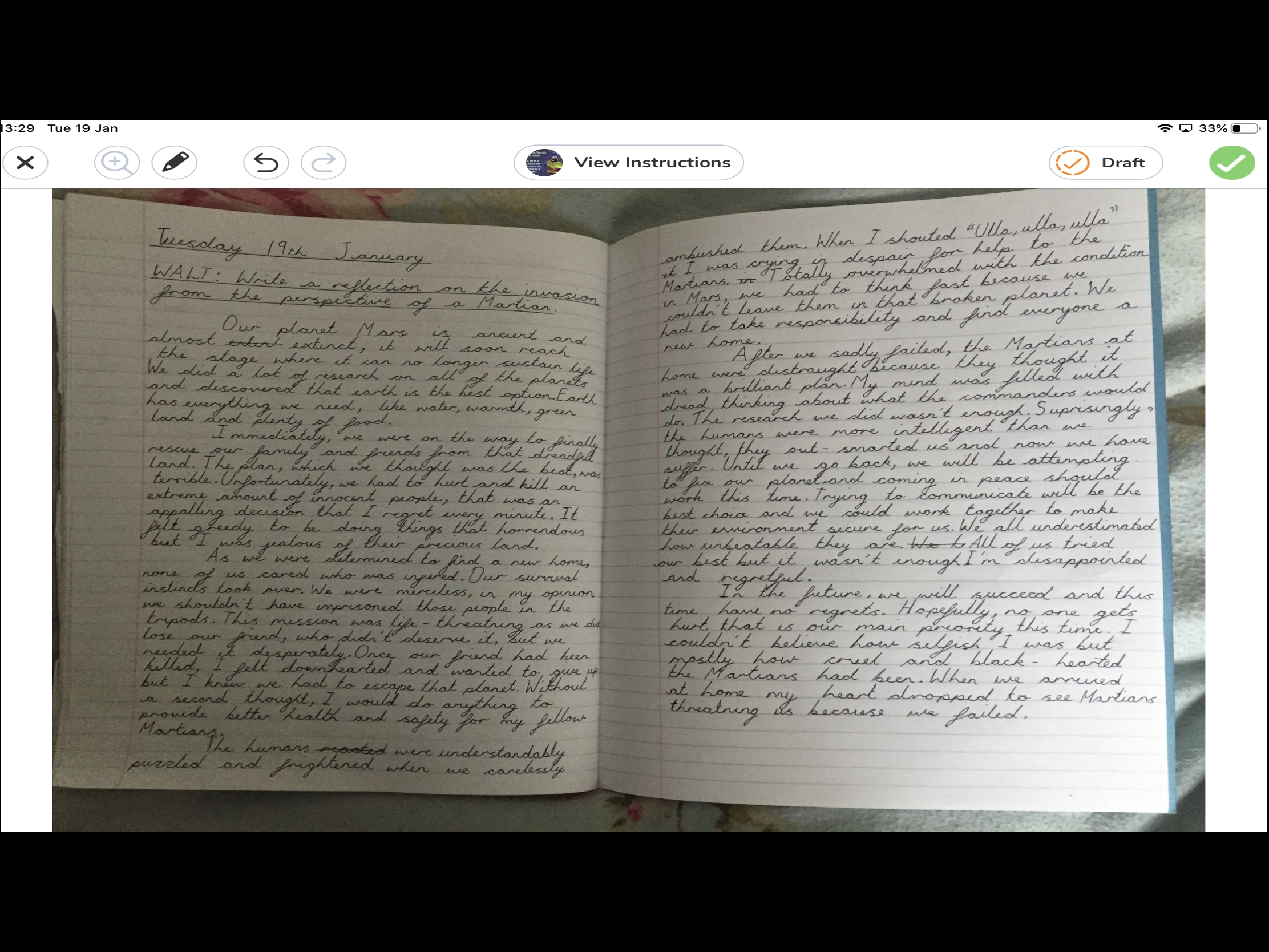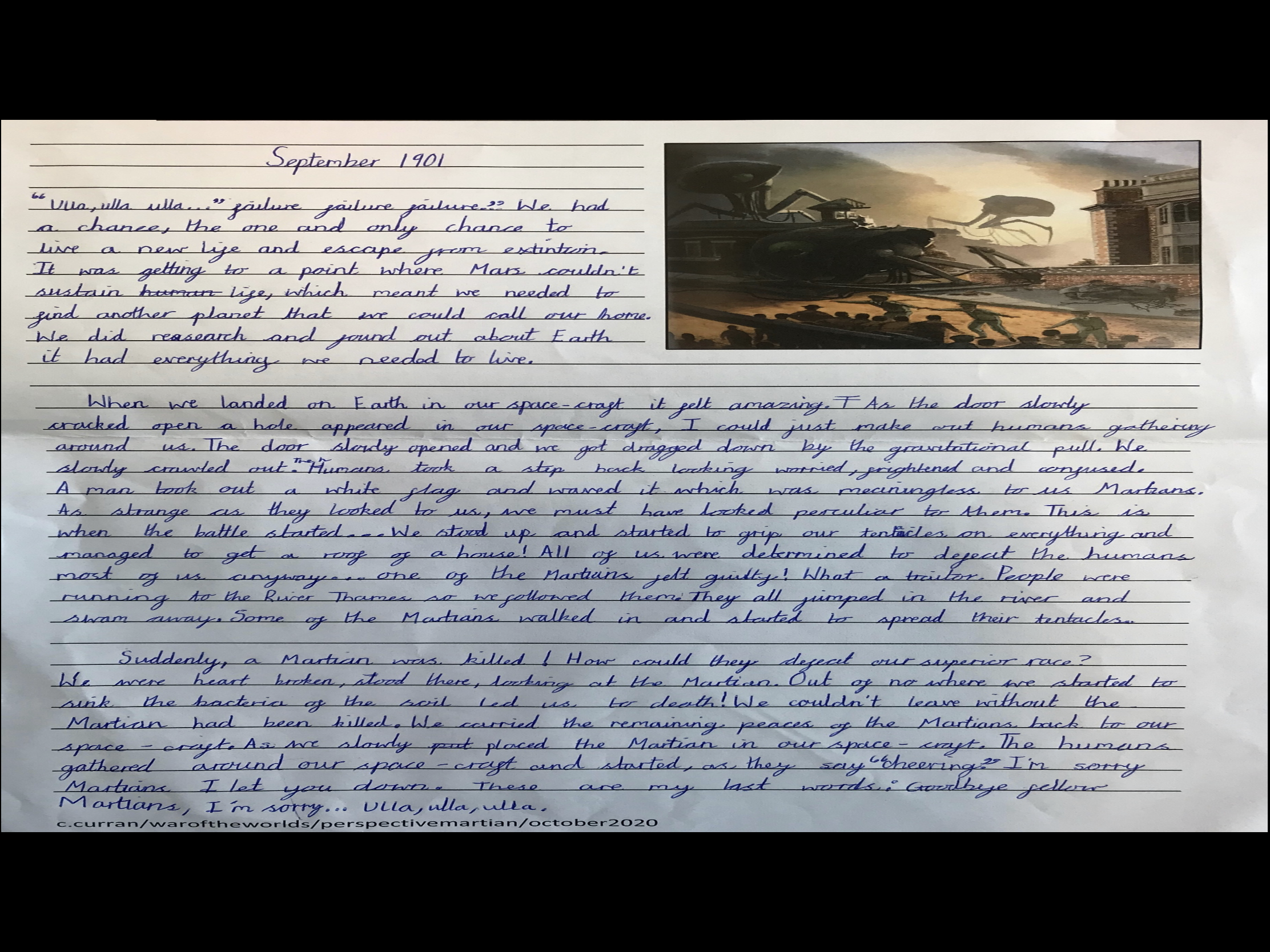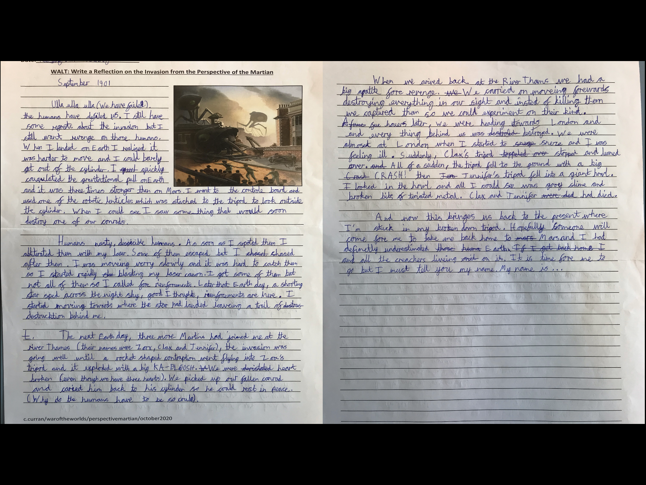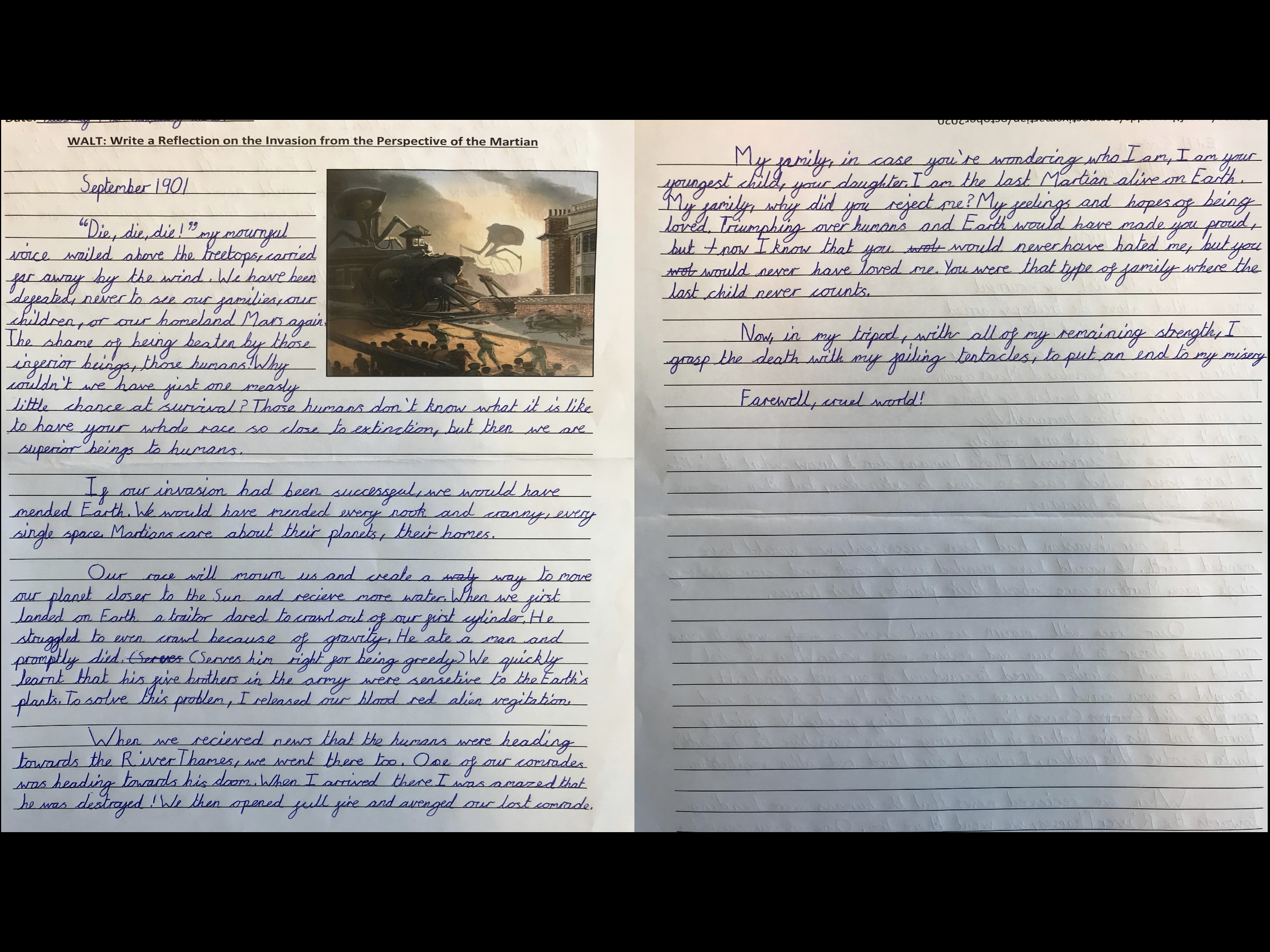 The personal reflections, as the Martians, helped us to conclude our work on The War of the Worlds together, whether at home or in school. It really was a super effort from everyone!